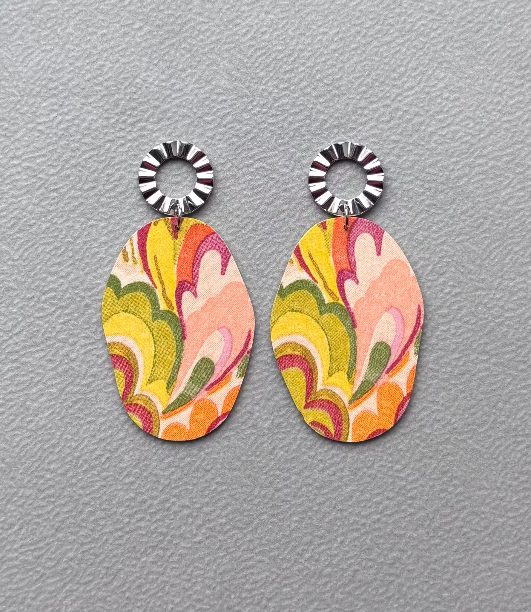 Total längd: 7.1 cm. Bredd: 3.5 cm. Mönster på båda sidorna. Naturvita handmålade kanter. Stift i rostfritt stål - nickelsäkra och färgbeständiga. Du kan välja om du vill ha silver- eller guldfärgade stift. Du kan även välja typ av stift, se bild 2. Stift nummer ett finns tyvärr inte i guldfärg. Skriv under ”meddelande” i kassan vilket stift och vilken färg du önskar.
