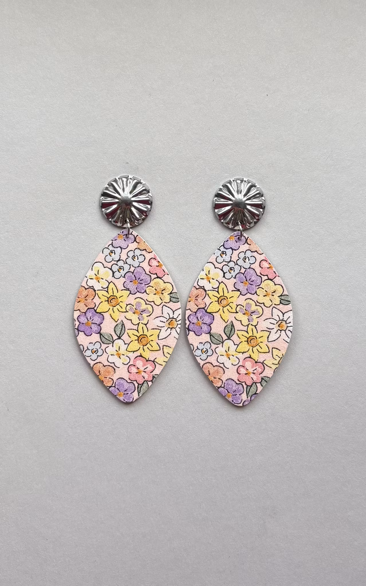 Total längd: 7.5 cm. Mönster på båda sidorna. Naturvita handmålade kanter. Stift i rostfritt stål - nickelsäkra och färgbeständiga. Du kan välja om du vill ha guld- eller silverfärgade stift. Du kan även välja typ av stift, se bild 2. Stift nummer ett finns tyvärr inte i guldfärg. Skriv under ”meddelande” i kassan vilket stift du önskar.